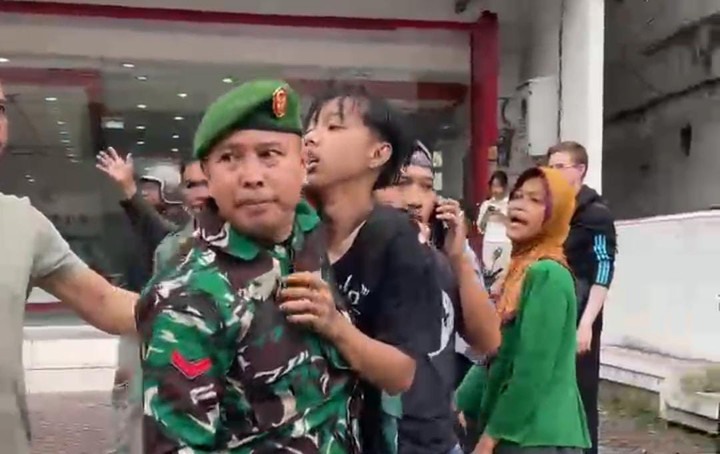 Lampung Geh, Bandar Lampung - Satu orang diduga provokator diamankan saat massa aksi dalam perjalan menuju Kantor DPRD Lampung. Berdasarkan pantauan Lampung Geh, terlihat aparat bersama mahasiswa dan juga warga berhasil mengamankan seorang pemuda dengan mengenakan baju hitam dan celana jeans. "Pas dalam perjalanan ada rame-rame dan pukul pukulan, ternyata ada Provokator aksi. Tapi udah diamankan," jelas salah satu peserta aksi. Terduga provokator langsung dibawa oleh petugas kemanan dari TNI untuk diamankan. (Put/Ansa)
