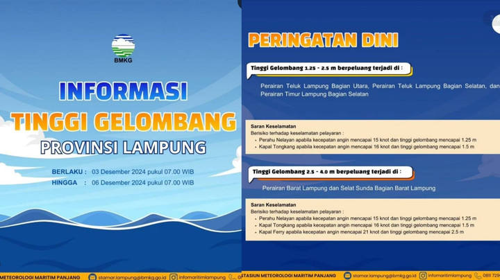 Berdasarkan keterangan resmi media sosial @infomaritimlampung, gelombang tinggi 2,5 meter hingga 4 meter berpotensi terjadi Perairan Barat Lampung dan selat Sunda bagian Barat Lampung.