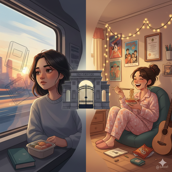 Rasa amannya nyata, tapi rasanya seperti hidup dalam dua potong waktu yang tak pernah bertemu. Pagi untuk perjalanan, siang untuk kampus, sore untuk perjalanan lagi. Malam untuk keluarga. Di mana ruang untuk jadi diri sendiri? Di kereta, mungkin. Dalam headphone yang menyetel lagu-lagu yang hanya dimengerti oleh jiwa yang lelah.