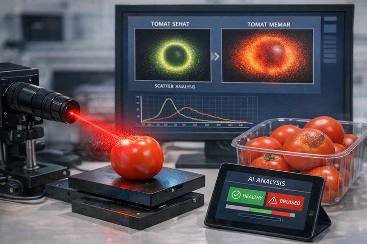 Pola cahaya hasil pemindaian laser dianalisis oleh sistem komputer yang mempelajari tekstur cahaya, seperti tingkat keteraturan dan keseragaman pola hamburan, bukan sekadar warna atau bentuk buah. Dengan bantuan kecerdasan buatan, tomat dapat diklasifikasikan secara otomatis menjadi sehat atau memar, tanpa menyentuh dan tanpa merusak buah, serta dapat dilakukan dalam waktu singkat.