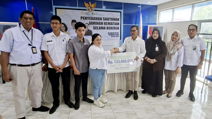 MANADO - Balai Pelayanan Pelindungan Pekerja Migran Indonesia (BP3MI) bersama BPJS KetenagakerjaanSulawesi Utara (Sulut), menyerahkan santunan sebesar Rp 133 Juta kepada pihak keluarga Denni Mewengkang, Pekerja Migran Indonesia (PMI) asal Sulut yang meninggal saat bekerja di Solomon Island.