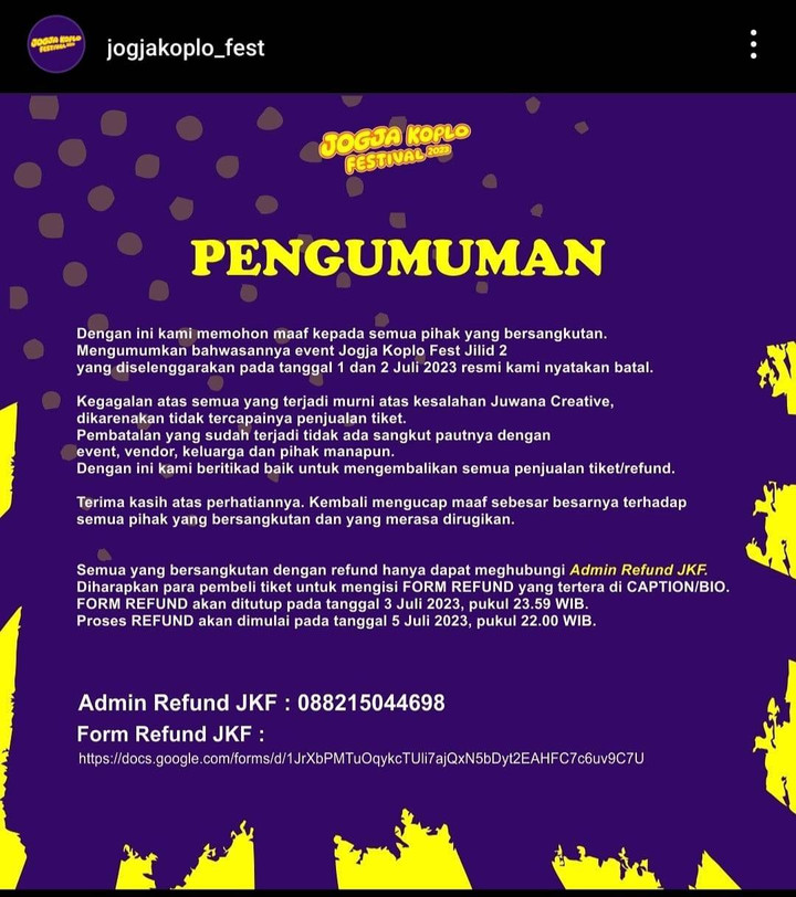 โMengumumkan bahwasanya event Jogja Koplo Fest Jilid 2 yang diselenggarakan pada tanggal 1 dan 2 Juli 2023 resmi kami nyatakan batal,โ tulis @jogjakoplo_fest.