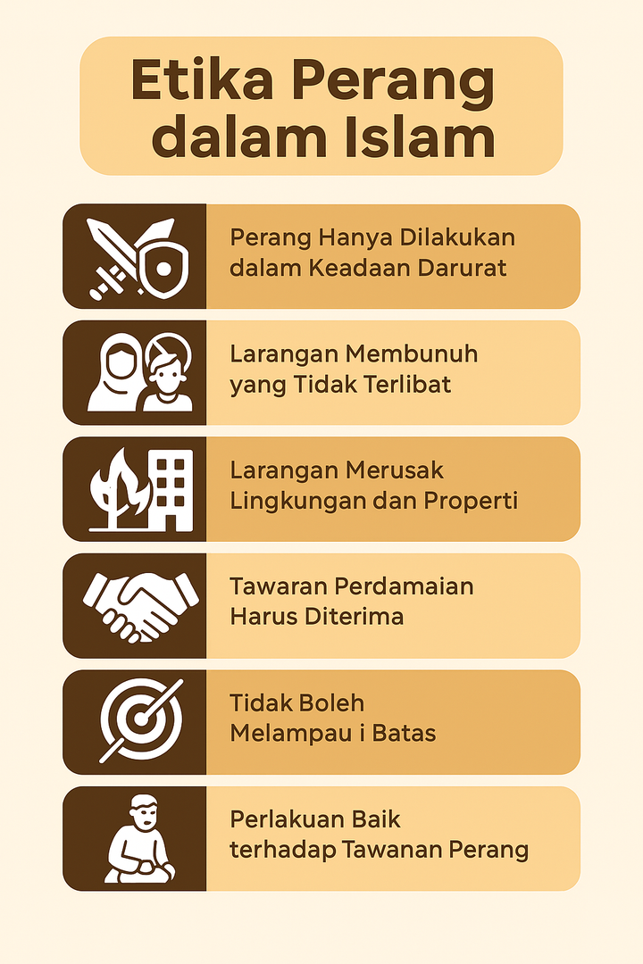 Islam memang sangat menjunjung tinggi perdamaian, bahkan jika sebuah peperangan pun harus terjadi, ada aturan-aturan dan etika yang harus dipatuhi. Etika perang dalam Islam diatur dengan sangat jelas dan ketat dengan tujuan utama untuk menjaga nilai-nilai kemanusiaan meskipun dalam situasi konflik. Aturan dan etika perang dalam Islam diantaranya yaitu:
