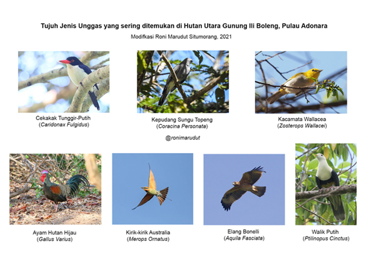 Ada tujuh jenis unggas yang sering ditemukan di sekitar hutan wilayah utara Gunung Ili Boleng. Tujuh jenis unggas tersebut yaitu, Burung Kepudang Sungu Topeng, Burung Walik Putih, Burung Kirik-kirik Australia, Burung Cekakak Tunggir Putih, Burung Kacamata Wallacea, Elang Bonelli, dan Ayam Hutan Hijau. Apabila sobat Gunung ingin berburu foto burung di alam bebas sekaligus mendaki gunung, sobat gunung perlu menyiapkan kamera terbaik kalian untuk mengabadikan momen menarik tersebut. Semoga kekayaan jenis burung Pulau Adonara tidak tereksploitasi oleh orang-orang yang tidak bertanggung jawab yaa Sobat Gunung.