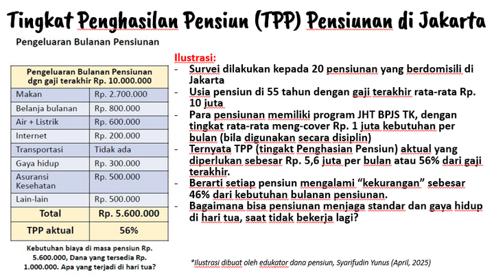 Tingkat Penghasilan Pensiun Ideal di Jakarta Capai 56% dari Gaji Terakhir, tapi aktuanyanya hanay 10% dari gaji terakhir. Apa yang harus dilakukan?Syarif Yunus