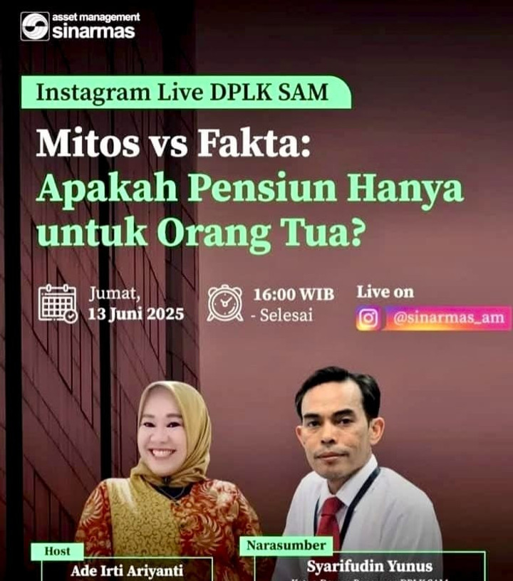 Sebagai bagian sosialisasi dan edukasi akan pentingnya Dana Pensiun Lembaga Keuangan (DPLK), Sinarmas Asset Management (SAM) melalukan live Instagram bertajuk “MITOS vs FAKTA: Apakah Pensiun Hanya untuk Orang Tua?” yang diikuti 20 peserta pada Jumat, 13 Juni 2025 sore. Bertindak sebagai narsumber Syarifudin Yunus (Ketua Dewan Pengawas DPLK SAM dan mantan Direktur Eksekutif Asosiasi DPLK) dengan moderator Ade Iri Ariyanti (Deputy Head of Sales DPLK SAM) melalui saluran IG: @sinarmas_am.