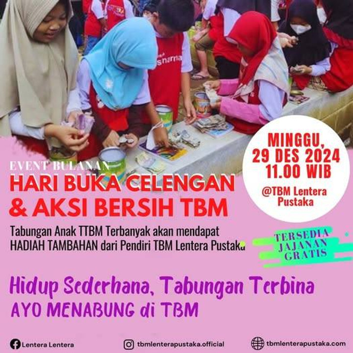 Nah sebagai tradisi tahunan di TBM Lentera Pustaka, setiap akhir tahun tepatnya Minggu, 29 Desember 2024 akan digelar “Hari Buka Celengan” untuk menghitung berapa besar jumlah celengan setiap anak. Sekaligus edukasi akan pentingnya menabung untuk anak-anak TBM yang belum maksimal mengisi celengannya. Saat Hari Buka Celengan, anak TBM dengan jumlah uang celengan yang paling banyak akan diumukan sebagai “penabung terbanyak” dan berhak mendapat hadiah berupa uang tambahan maksimal Rp. 500.000 dari Pendiri TBM Lentera Pustaka. Hadiah diberikan sebagai motivasi dan semangat akan pentingnya rajin menabung di TBM. Di saat hari yang sama, sekitar 70 ibu-ibu pengantar anak TBM Lentera Pustaka Bersama relawan juga melakukan "Aksi Bersih Lingkungan TBM" dengan memungut sampah dan membangun taman bacaanyang bersih.
