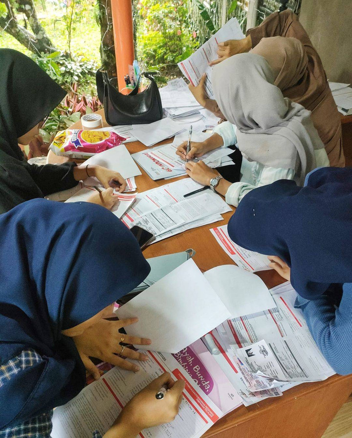 Tanpa pamrih, wali baca dan relawan TBM Lentera Pustaka mengisikan formular SIMPEL (maklum Minggu sebelumnya, formulir dibawa pulang tapi salah mengisinya). Lalu mengecek KK (kartu keluarga) dan KTP orang tua dan kartu identitas anak. Pekerjaan administrasi yang tidak mudah dan membutuhkan ketelitian, Sekali lagi, semua itu dilakukan wali baca dan relawan TBM Lentera Pustaka tanpa pamrih. Tulus berbuat untuk kebaikan anak-anak TBM Lentera Pustaka dan pembukaan rekening Bank Sinarmas.
