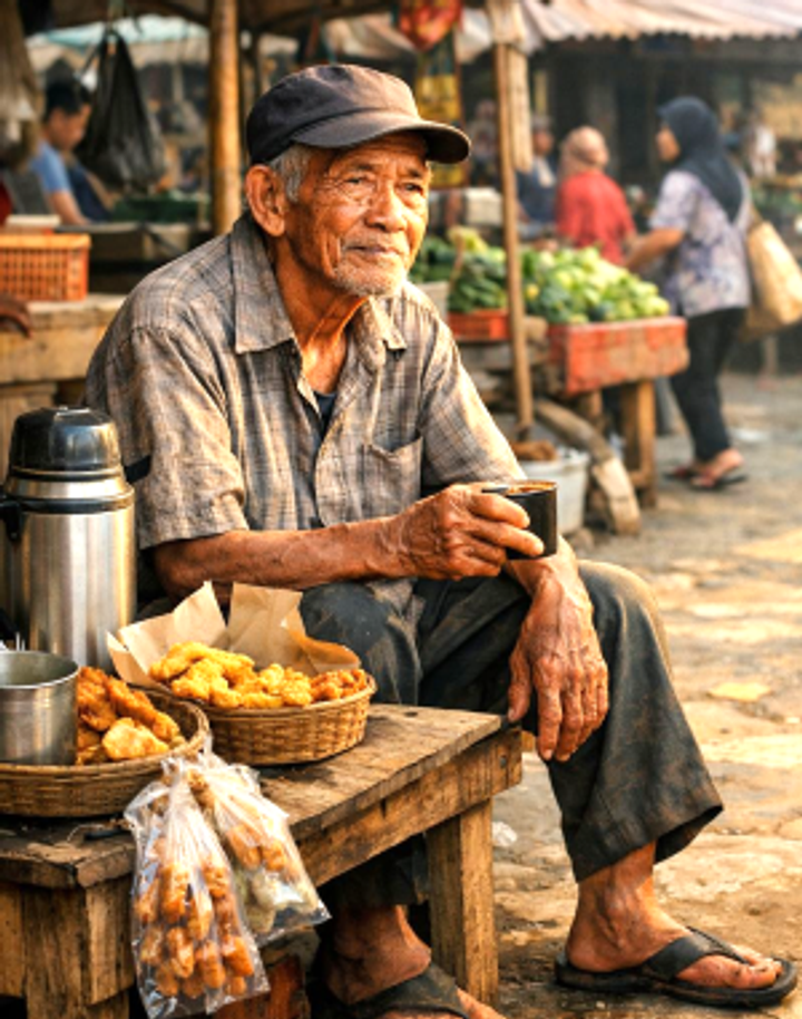 Setiap pagi, sebelum matahari sepenuhnya naik, Pak Darto sudah duduk di bangku kayu kecil di sudut pasar. Tangannya yang mulai gemetar masih setia menggenggam termos kopi dan beberapa bungkus gorengan buatan istrinya. Dulu, bangku itu selalu ramai, pelanggan datang silih berganti, bercanda sambil menawar harga. Kini, lebih sering sepi.