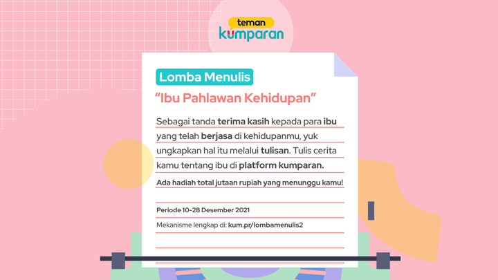 Dalam momen Hari Ibu pada Desember ini, kumparan ingin merayakannya dengan membuat lomba menulis gratis yang mengangkat tema “Ibu Pahlawan Kehidupan”.teman kumparan
