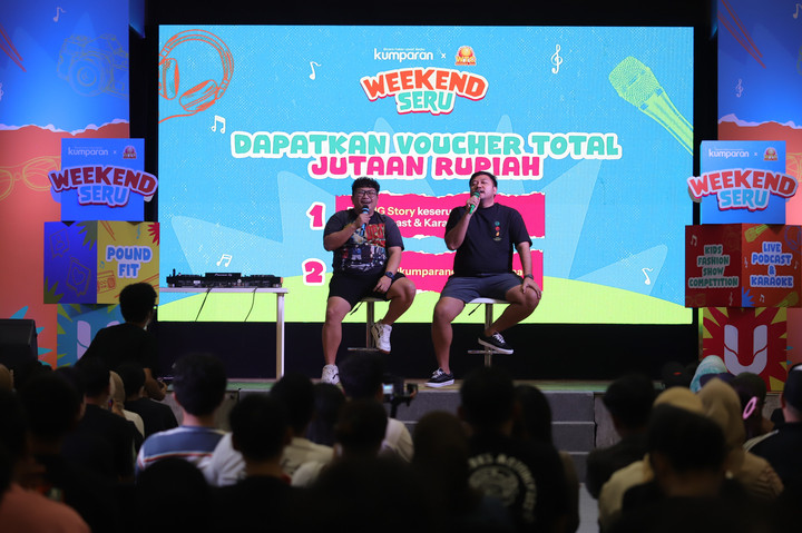 Kehadiran Podcast Seminggu jadi puncak dari rangkaian acara kumparan Weekend Seru yang sudah berlangsung sejak pagi. Sebelumnya, para pengunjung lebih dulu diajak seru-seruan lewat sesi olahraga bareng di kumparan Hangout “Pound Fit” dan kumparanMOM Playdate “Kids Fashion Show Competition”.