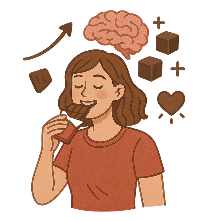 Cokelat kaya akan senyawa yang baik untuk kesehatan dan dapat memengaruhi perasaan melalui interaksi antar komponen di dalamnya. Penelitian Casperson et al. (2019) menunjukkan bahwa kandungan gula dalam cokelat dapat memberikan efek dalam peningkatan perasaan positif. Semakin tinggi kadar gula dalam cokelat, seperti pada milk chocolate, maka semakin kuat efek psikoaktifnya.
