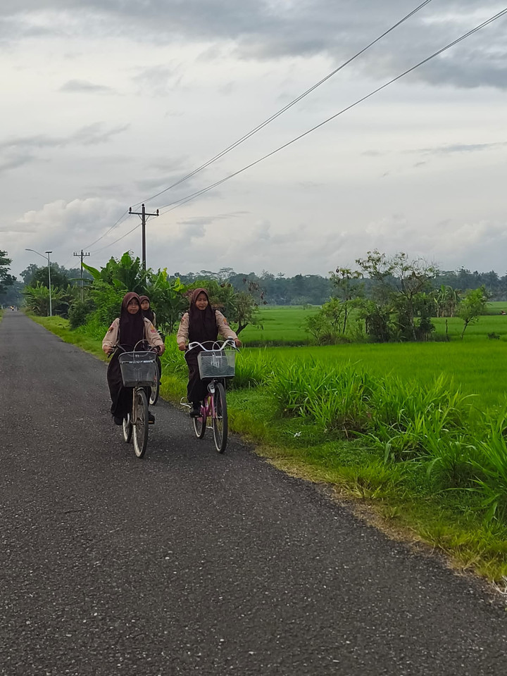 Di tengah langkah, mata kami tertuju pada pemandangan yang jarang sekali terlihat di tanah rantau: anak-anak desa berangkat sekolah dengan sepeda. Dari SD hingga SMA, mereka mengayuh dengan penuh semangat. Wajah-wajah ceria menghiasi jalanan, tawa riang terdengar di antara deru roda yang berputar. Energi kebahagiaan itu menular, membuat siapa pun yang melihat ikut tersenyum.