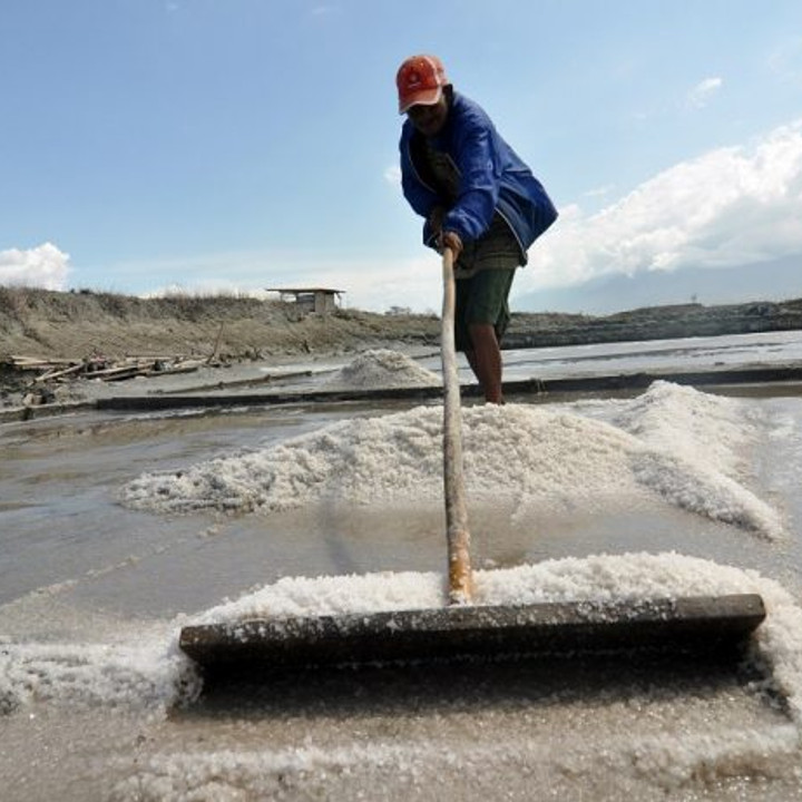Seorang pekerjatengah bekerja di tambak garam di wilayah Kabupaten Pasuruan. Hingga medio 2018, prodiuksi garam di Pasuruan masih 1% dari target 15.250 Ton.