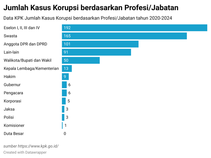 Berdasarkan statistik KPK ribuan kasus korupsi dilakukan dari berbagai kalangan. Sejumlah profesi dan jabatan pernah terlibat kasus korupsi. Termasuk jajaran pejabat eselon atau jabatan struktural di kalangan pegawai negeri sipil (PNS). Sepanjang 2020 hingga 2024, KPK melaporkan terdapat 645 kasus korupsi. Dari data tersebut, profesi / jabatan terbanyak yang melakukan korupsi pelakunya dari PNS Eselon I, II, III dan IV.
