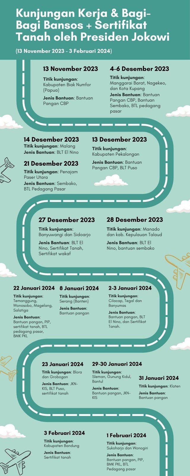 Fakta ini bisa kita lihat dari agenda kunjungan kerja Presiden RI sepanjang November-Desember 2023 hingga Januari dan awal Februari 2024. Tak hanya membagi-bagikan bantuan pangan (beras 10 kg), namun Presiden juga ikut membagikan PIP, sembako, menyambangi peserta JKN-KIS, bagi-bagi sertifikat tanah, Bantuan Tunai Langsung (BTL) pedagang pasar, dan BLT puso untuk petani. Ini menjadi semacam 'paket lengkap' kunjungan kerja presiden di 36 titik dalam 3 bulan jelang Pencoblosan.