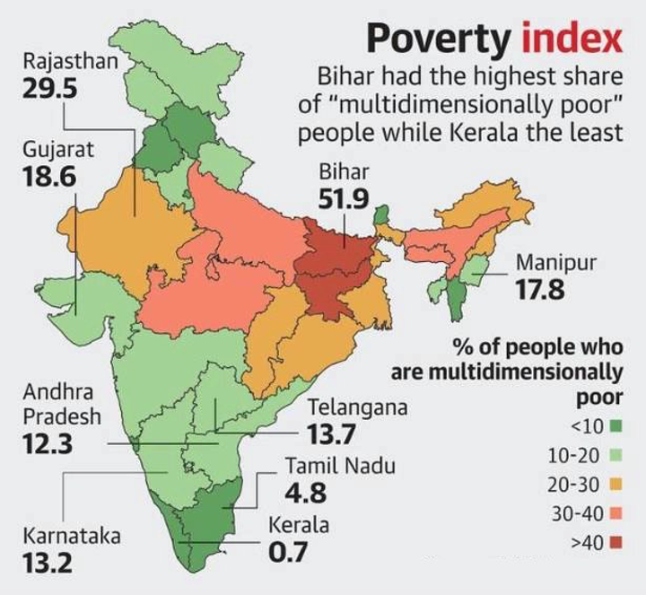 Menurut laporan NITI Aayog tahun 2023, tingkat kemiskinan multidimensi India menurun dari sekitar 25% (NFHS-4, 2015–16) menjadi kurang dari 15% (NFHS-5, 2019–21). Artinya, 135 juta orang keluar dari kemiskinan dalam kurun waktu lima tahun. Secara keseluruhan, sejak 2005–06, sekitar 415 juta warga India telah beranjak dari kemiskinan, dengan 270 juta di antaranya terjadi antara 2005 dan 2015.
