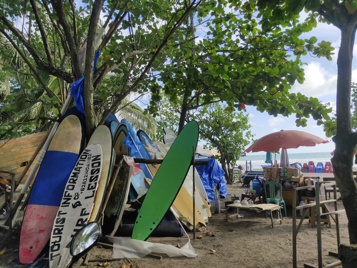 Di bawah matahari yang terus menemaninya kala siang, kulitnya menggelap, menjadi saksi bisu perjuangan Pak Budi mengais uang. Hanya memakai jaket lusuh yang dipadukan celana pendek, ia pergi bekerja dengan mengandalkan dua aplikasi layanan ojek online sambil menjaga lapak sewa papan selancar dan kelapa muda.