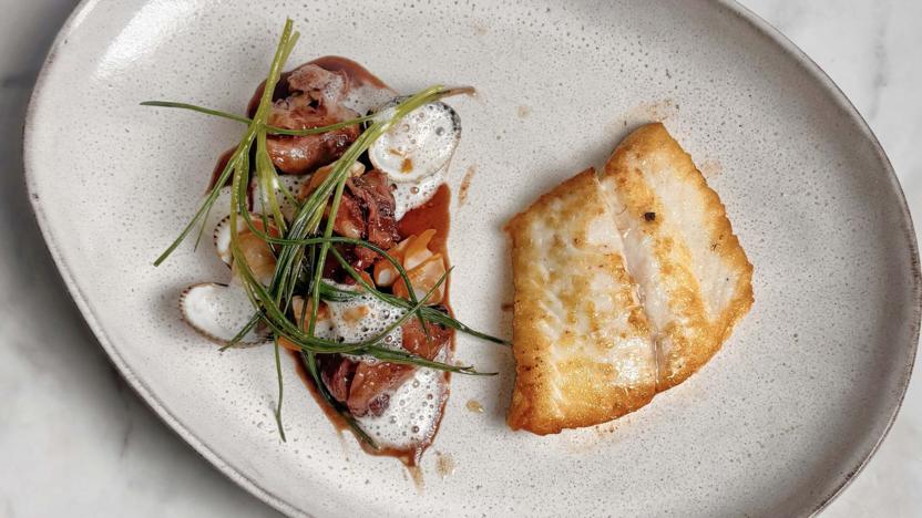 Pan-fried brill with cockles and oxtail