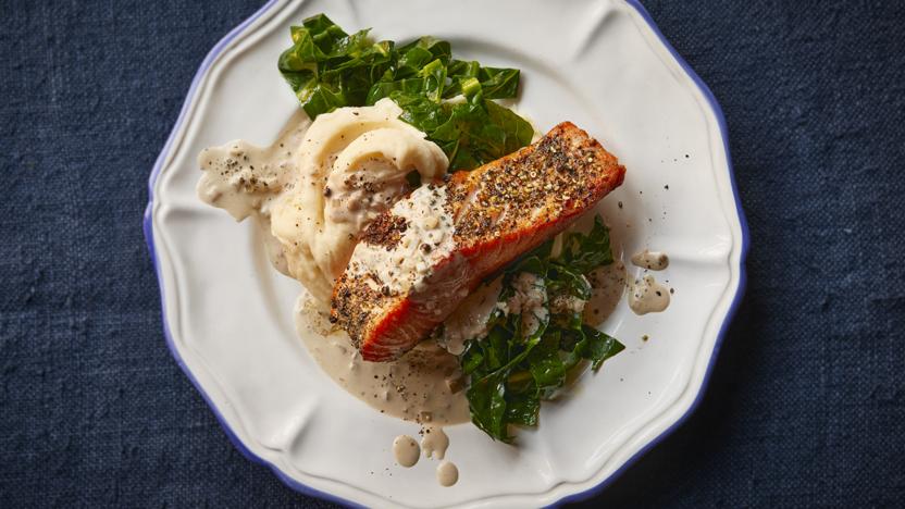 Salmon and monkfish skewers marinated in honey, rosemary and lemon