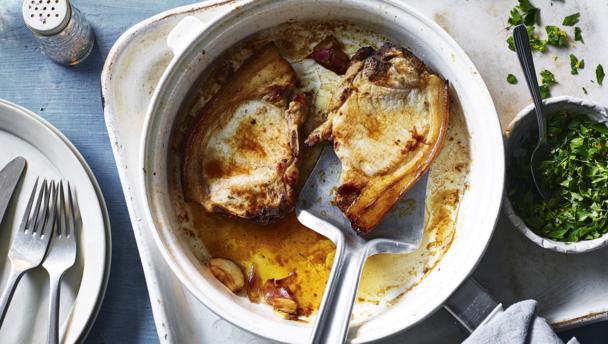 Place the pork chop in the pan, fatty side down to brown it. Then lay the chop flat and cook for around five minutes for a 3cm/1¼in chop. Turn the chop over so that it is well-browned on both sides. You can fry a flattened clove of garlic to cook alongside the chop to flavour it very gently.