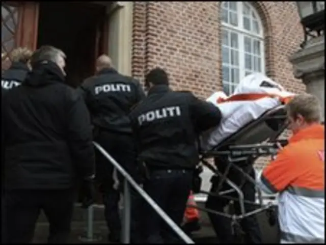 Tersangka, yang ditembak polisi di luar rumah kartunis Kurt Westergaard di kota Aarhus hari Jumat, diusung ke pengadilan dengan tandu pasien.