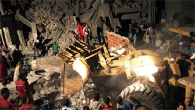 Mayat-mayat ditarik dari reruntuhan rumah tingkat tiga di distrik Souk al-Juma yang dikatakan hancur karena serangan udara NATO.