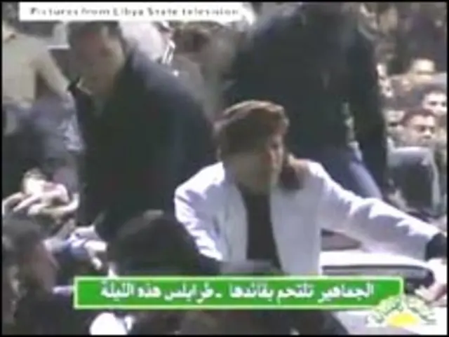 در همین حال، تصاویر تلویزیون دولتی لیبی نشان داده که معمر قذافی روز جمعه برای دقایقی در میان هوادارانش در میدان سبز طرابلس حضور یافته است.