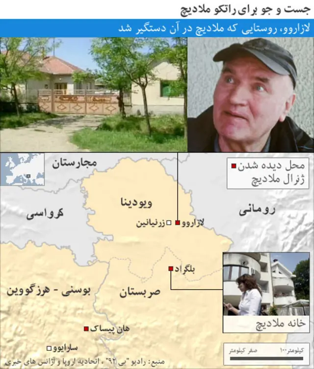 به نوشته سایت خبری ب ۹۲، سرانجام ماموران پلیس صرب، رد ژنرال ملادیچ را در دهکده لازاروو، در شمال صربستان پیدا کردند. گفته می شود که نام او در مدارکی که همراه داشته، میلورا کومادیچ ذکر شده است.