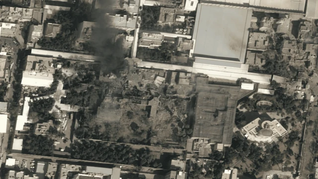 Imagens de satélites também mostraram danos consideráveis no complexo, incluindo edifícios queimados, destroços e uma coluna de fumaça.