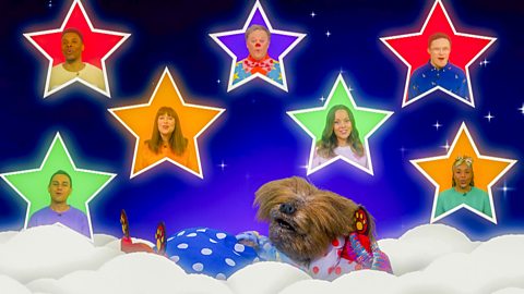 Dodge is fast asleep and dreams about his CBeebies friends singing him a bedtime song!
