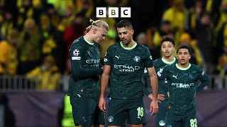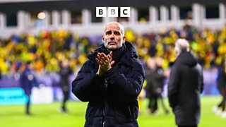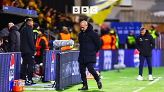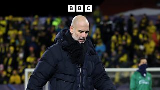 Pep Guardiola reacts to Man City's 3-1 loss at Bodo/Glimt.