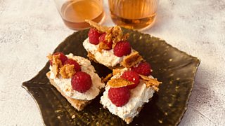 Cranachan Flapjacks with raspberries, whiskey, and honeycomb cream