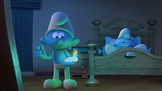 Mae plentyn o'r gofod yn ymweld â'r Smyrffs ac yn ei swyno i'w gwneud yn ffrindiau iddo...
