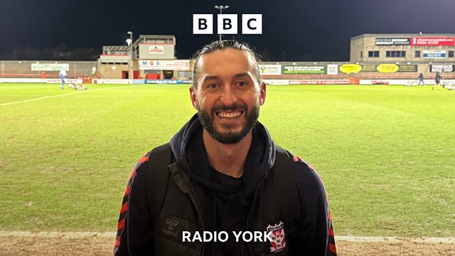York City midfielder Ollie Banks speaking to David Ward, after scoring the winning goal in the 99th minute of their 1-0 win away at Morecambe.