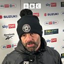 Paul Warne reacts after his MK Dons side beat Harrogate Town 4-1 at home.