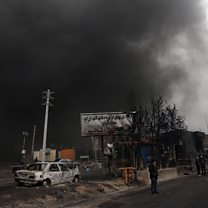 Photo: A view of the Main gate to the Shahran Oil Refinery as smoke still rises; Credit: Abedin Taherkenareh/EPA/Shutterstock)