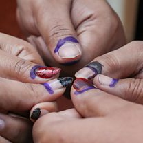 (Photo: A group of young women show their inked thumbs after casting their votes at a polling centre at Dania College, at Dhaka Government Muslim High School, Bangladesh, 12 February 2026. Credit: Monirul Alam/EPA)