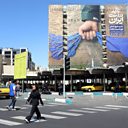 (Photo: Iranians cross the street in front of a large-scale billboard referring to the Strait of Hormuz and reading in Persian 'Forever on Iran's hand' is displayed at a square in Tehran. Credit: Abedin Taherkenareh/EPA).