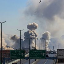 (Image: Motorists drive along an expressway as plumes of smoke rise after a strike in Tehran, Iran. Credit: ATTA KENARE / AFP via Getty Images)