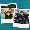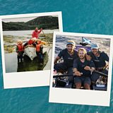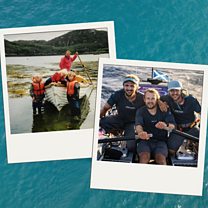 (Photo: Two images of the Maclean brothers in polaroid frames laid over a background image of the Pacific Ocean. The photo on the left is of the brothers as little boys on the west coast of Scotland. Two of them stand in shallow water in front of a white rowboat, while the third brother playfully clambers on top of the boat. Behind them, their father is onboard, holding an oar into the water to keep the boat still. The photo on the right is a contemporary image of the brothers sitting aboard their boat, the Rose Emily, in the midst of the Pacific Ocean. The eldest brother Jamie sits in the middle, holding the oars, with the youngest Lachlan to the left of him and the middle brother Ewan to the right. The trio smile broadly. Credit: Maclean family handouts)