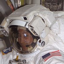 (Photo: Astronaut Edward T. Lu is pictured wearing a white Extravehicular Mobility Unit (EMU) spacesuit in the Quest airlock on the International Space Station. Credit: NASA)