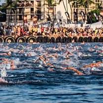 (Photo: Triathletes compete in the 3.8km swim during the Ironman World Championships on 10 October, 2015, Kailua Kona, Hawaii. Credit: Jason Rappaport/Getty Images)