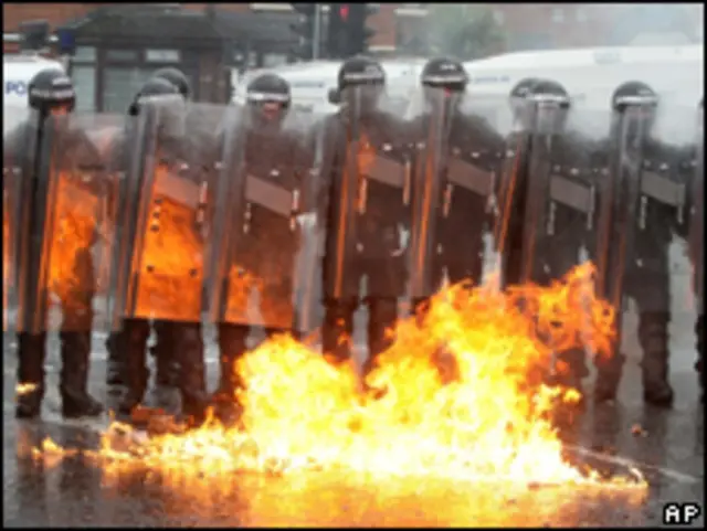 В ходе беспорядков после традиционного парада оранжистов в Северной Ирландии пострадали шестеро полицейских. Полиции пришлось применять водометы.