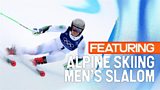 Action from the men's slalom at the Milano Cortina 2026 Olympic Winter Games.