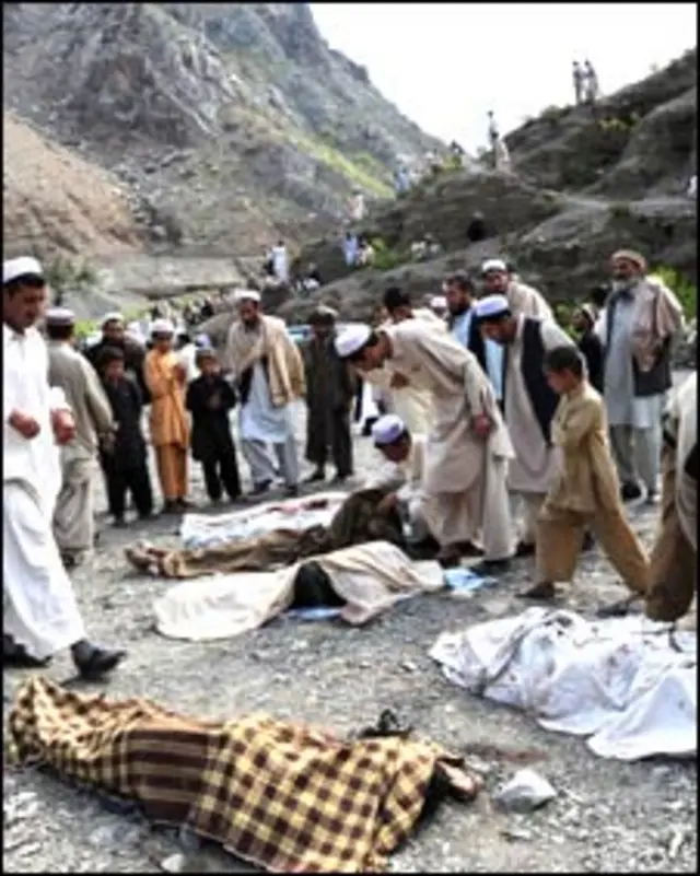ہسپتال میں ڈاکٹر اعمال خان نے بی بی سی کو بتایا کہ ہسپتال میں بارہ لاشیں اور پینتیس زخمیوں کو لائے گئے ہیں اور ہلاک ہونے والوں میں ایک پانچ سالہ بچہ بھی شامل ہیں۔