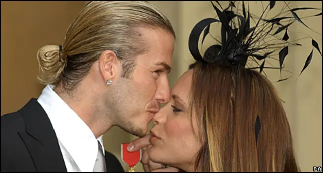 Cô dâu là cựu thành viên ban nhạc Spice Girl, bây giờ nổi tiếng về chuyện ăn mặc; chú rể là cầu thủ bóng đá và không ngại thử kiểu tóc hay hình xăm mới.