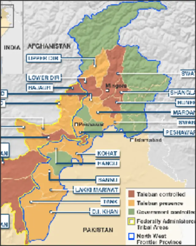 Tấm bản đồ do BBC công bố hôm nay 13/05/09 xác định rằng chỉ có 38% vùng tỉnh Biên giới Tây Bắc Pakistan (NWFP) và phụ cận là còn nằm dưới sự kiểm soát của chính phủ.