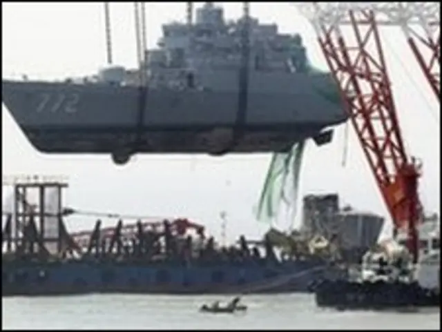 Xác của chiến hạm nặng 1.200 tấn, bị gãy làm đôi đã được kéo lên trên mặt nước để xem xét một cách chi tiết.